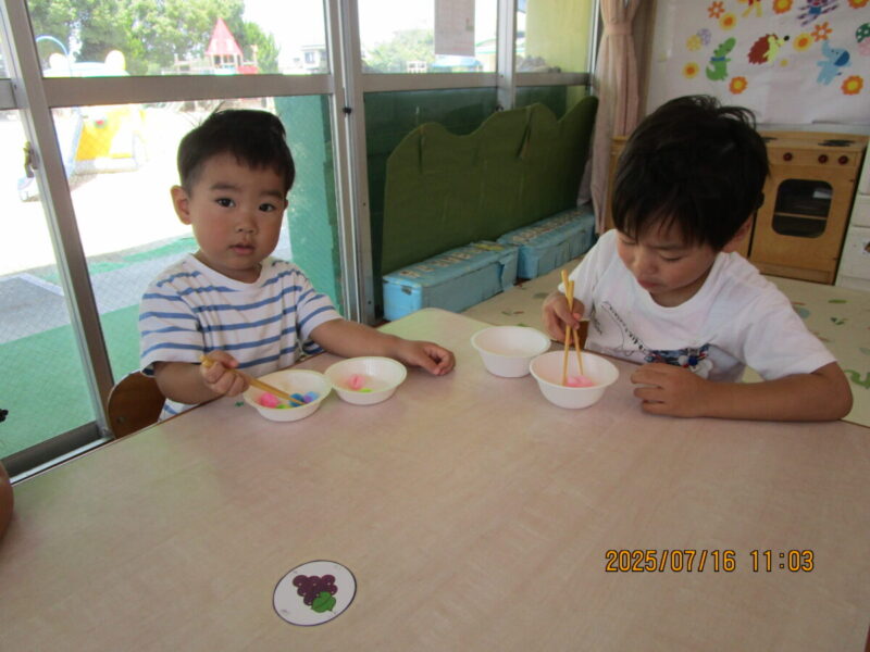 今年度、4回目のにこにこ広場が行われました。今回は4組の親子が参加して、牛乳パックや乳酸飲料の空き容器を使って音のなるおもちゃの製作をしてみました。簡単にできる物だったので子どもたちと一緒にビーズを入れたり、シールを貼ったりしてそれぞれかわいいものが仕上がりました。給食・離乳食も親子でおいしく食べて、楽しい時間を過ごす事が出来ました。