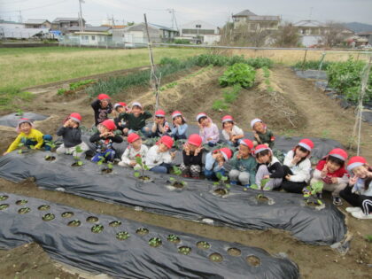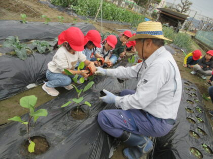 畑に夏野菜を植えました。ぞう組がチャレンジしたのはなすびの苗植え。おじちゃんに教えてもらいながら慎重に植えていき、さいごには元気にみんなで「おいしくなーれ」とパワーを送ってきました。今年の畑には、なすび・きゅうり・大根・ブロッコリー・スイカ・メロンを植えています。生長が楽しみです。