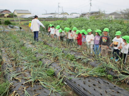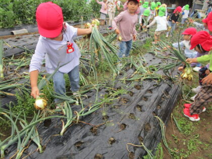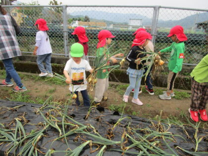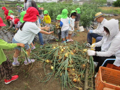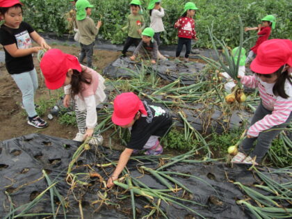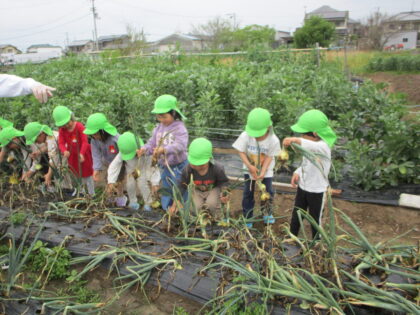 今日はきりん、ぞう組が玉ねぎ堀りをしました。雨がパラパラしてきたので急ぎ足ではありましたが、一気に玉ねぎを収穫しました。今年の玉ねぎは大きく育ってました。また、給食にでてくるのが楽しみです。子どもたちのにぎやかな声にびっくりしたカエルやトカゲも出てきて、追いかけて楽しんでました。