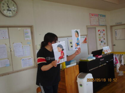 栄養士の先生に食事のマナーについて教えてもらいました。 姿勢よく座り、肘をつかないこと。お皿を持って食べること。お箸を正しく持つこと。を学びました。 「お皿はこうやって持つよね。」などと友だちと見せ合いながら給食を食べました。