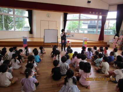 2025.6.24 お知らせ6月24日 保健集会(3・4・5歳児) 正しい手洗いと歯磨きの仕方について学びました。「あわあわ手あらいのうた」をうたいながら楽しく参加できました。 自分で歯磨きをした後は、お家の人に仕上げみがきをしてもらうお約束もしましたよ。