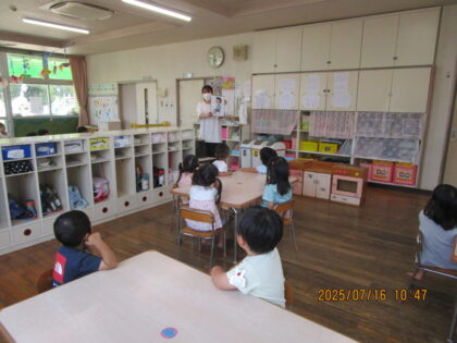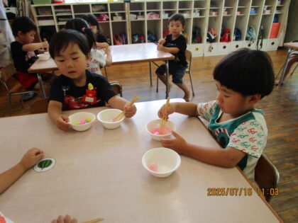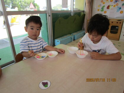 こあら・うさぎ組にとっては、初めての「給食の日」でした。給食室の先生からお箸の正しい持ち方を教えてもらいました。お箸の持ち方に慣れてきたらボール移しゲームに挑戦。お箸を使ってたくさん遊びました。