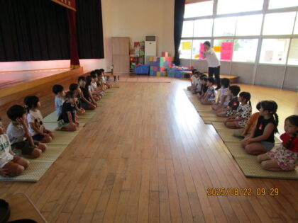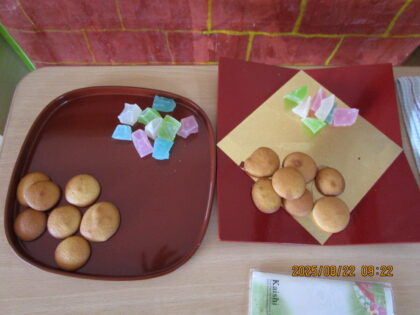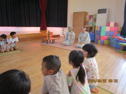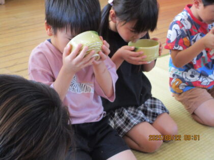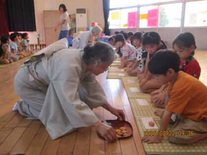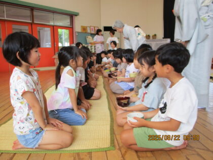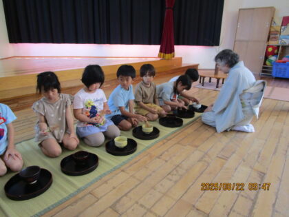 今日はぞう組さん、初めてのお茶会に参加しました。お茶の先生の前で少し緊張していましたが、一つ一つお作法を教えていただきながらお茶を点てていきました。甘いお茶菓子の後の抹茶は「にがい」「おいしい」とそれぞれでしたが、また一つ楽しい経験が増えた一日となりました。