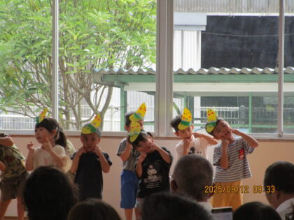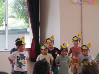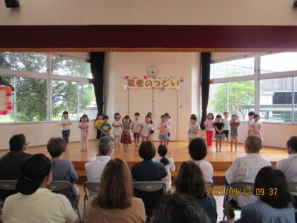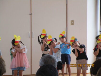 まずは、3・4・5歳児クラスが練習した歌や踊りを披露し、楽しんでいただきました。