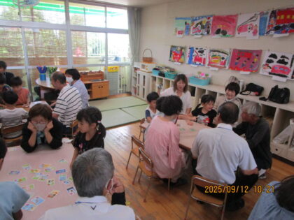 各クラスの発表の後は、ぞう組さんとおじいちゃん、おばあちゃんとの触れ合いタイム。トランプやかるたを一緒にして、楽しい時間を過ごしました。