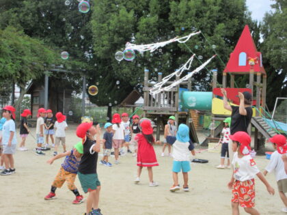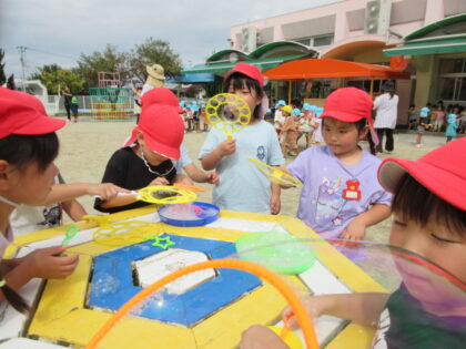 たくさんのしゃぼん玉ができる道具をしていただき、好きな用具を使ってしゃぼん玉あそびを楽しみました。大きなしゃぼん玉ができるたびに「わぁ~!」と夢中で追いかける姿がかわいらしく、笑顔いっぱいの楽しい時間を過ごしました。