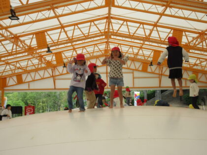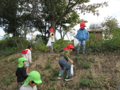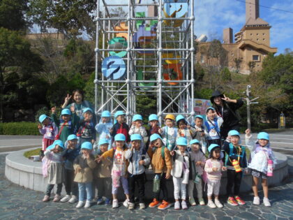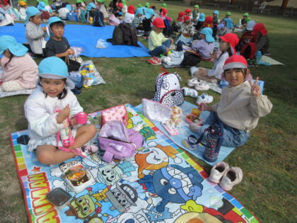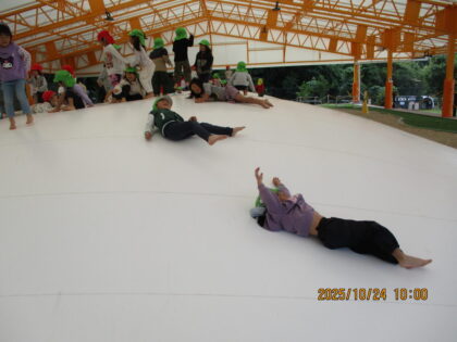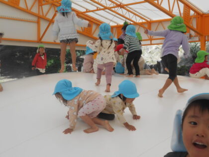 今月のわくわくタイムは秋の遠足でこどもの城に行ってきました。3,4,5歳児クラスがそれぞれバスで出発。ついたクラスからどんぐり拾いをしました。夢中で斜面もよじ登って大きいものや長細いもの、いろいろな形のどんぐりをたくさん見つけました。気づいたらひっつきむしだらけの服になってて、それをみんなで取るのも楽しかったです。ふわふわドームではみんなでジャンプ!お弁当は異年齢でシートをくっつけて食べました。ぞう組は帰りは徒歩で。疲れて昼寝はぐっすりでしたが、とっても楽しい一日でした。