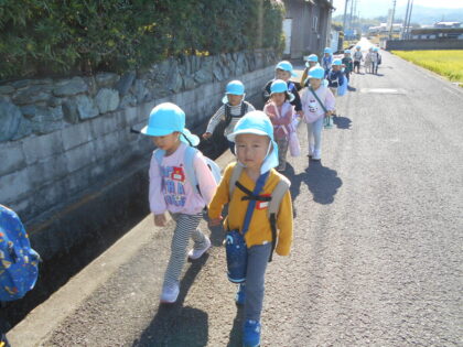 たくさん歩いて遊んだので、給食室で作ってもらったお弁当も格別。「おいしいね。」とおしゃべりもはずんでいました。