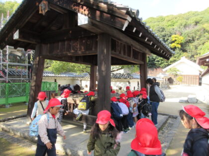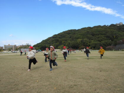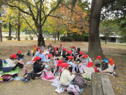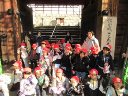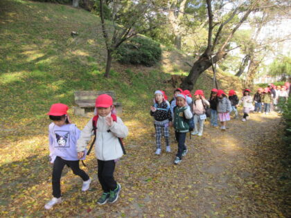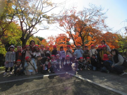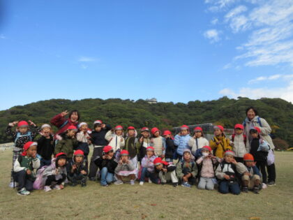 今回は郊外電車に乗り市民会館まで歩いて行き、角笛シルエットの影絵を観てきました。初めて電車に乗る子もいましたが、緊張しながらもお友だちとみんなで乗ってわくわく楽しんでいました。影絵では「やさしいらいおん」のお話といろいろな歌を楽しみました。影絵がどんなふうになっているのかも見る事ができ、子どもたちもずっと集中して観ていました。城山公園広場でお弁当を食べた後は二之丸史跡庭園見学してきました。秋を感じたり、歴史に触れたりと貴重な経験をしてきました。とても楽しい一日でした。