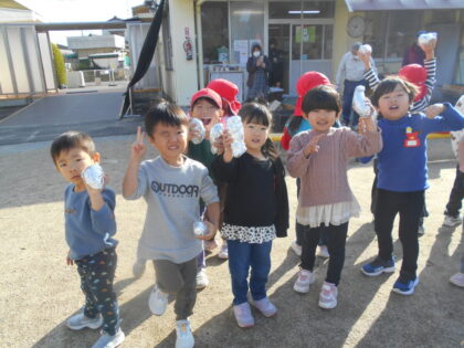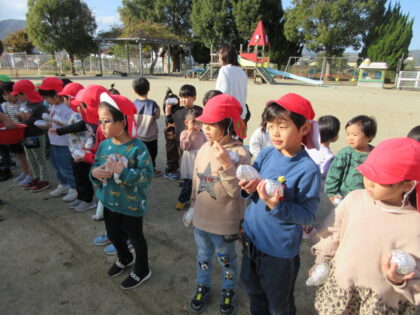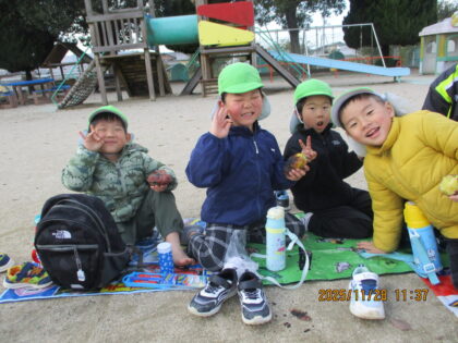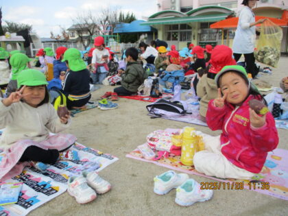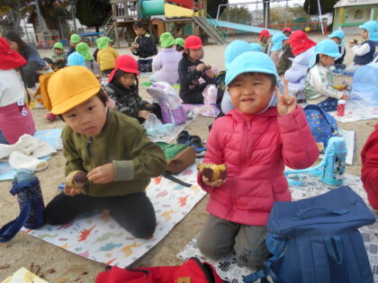 お芋を新聞紙で巻いてアルミホイルで巻くところから自分たちでやりました。ドラム缶に入れる所はぞう組の出番。熱い所を気をつけながらお芋を入れていきました。「おいしくなーれ。」とお願いをして焼き芋が出来上がるまでは、それぞれのクラスの発表会の出し物を見せ合いました。焼き芋と給食は園庭の真ん中でみんなで食べました。とても美味しくて楽しいわくわくタイムでした。