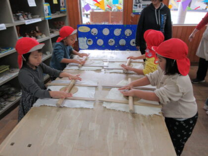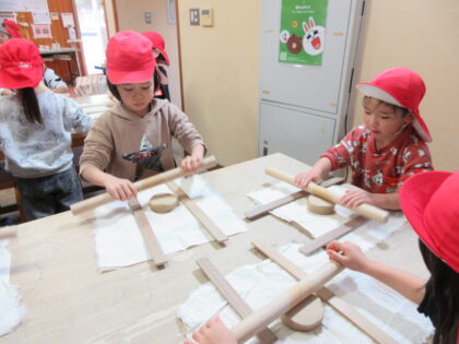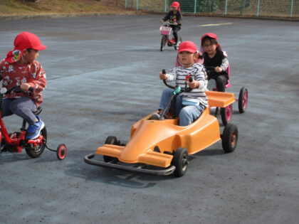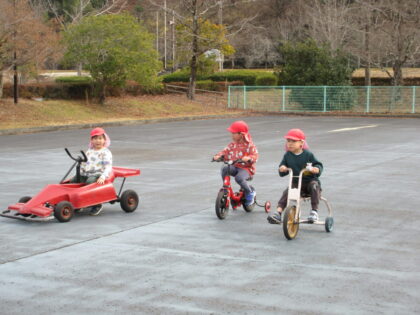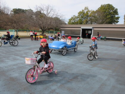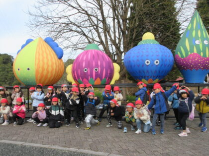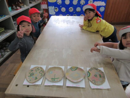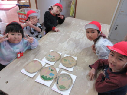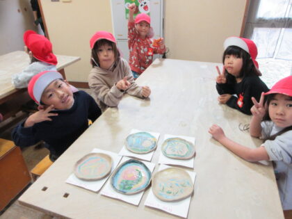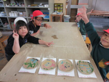 今日はぞう組が体験学習に行ってきました。こどもの城の陶芸館では粘土からお皿の形作りをして絵付けをしました。練習の成果もあり、ひとりひとりが慎重に製作していました。昼食はレストラン北斗でお子さまランチを食べました。いつもより量もあり食べきれるかなと思ったのですがしっかり食べて「おいしかったね。」と大満足のぞう組さんでした。お腹いっぱいになった後はゆとり公園に移動しておもしろ自転車で1時間たっぷり楽しんできました。公園でおやつを食べてさすがに疲れたかなと思ったけれどまだまだ物足りなかったようで、最後は坂を駆け上がって長い滑り台にも挑戦してきました。たくさんのお約束もしっかり守れて楽しい体験学習となりました。