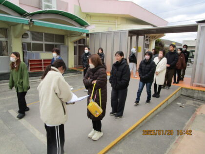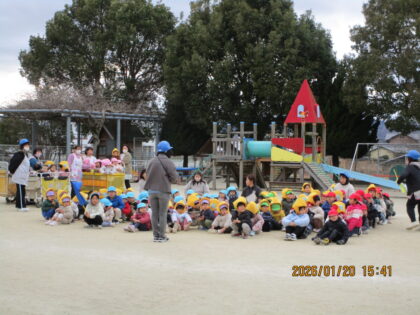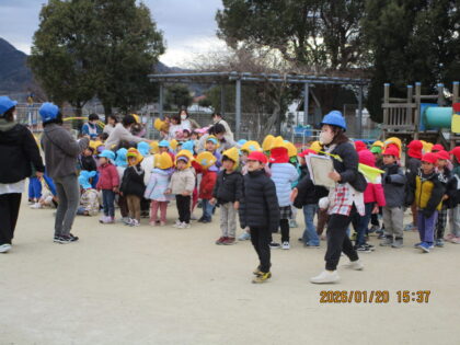 2026.2.3 日々のブログ1月20日避難訓練(引き渡し訓練) 16:05から地震設定の避難訓練を行い、 16:10から引き渡し訓練を開始しました。 当日は気温も低く寒い中お待たせしてしまいましたが、 多数の保護者の方にご参加いただきありがとうございました。