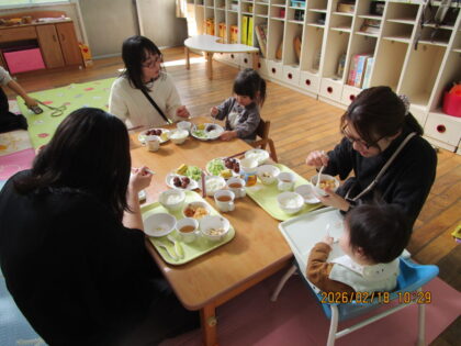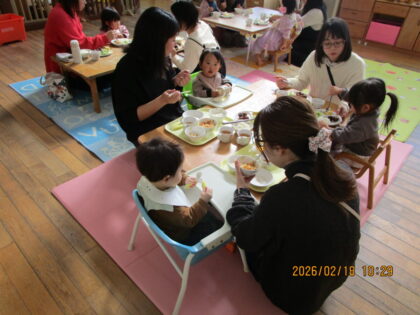 親子で雛飾り作りを楽しんだり、給食を食べたりして、楽しい時間を過ごしました。