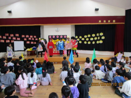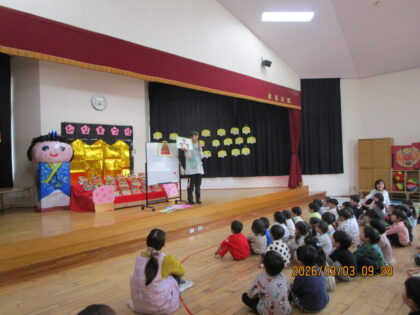 今月のわくわくタイムは「ひなまつり会」でした。各クラスで作った雛飾りをステージに飾り、ホールは華やかでした。