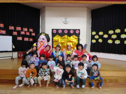 ひな祭りの由来クイズをしたり、1年間一緒に活動してきた異年齢のチームでゲームを楽しんだりしました。最後は子どもたちが選んだ袋の中の衣装を着て、保育士が変身。お雛様の衣装を当てたチームは大喜びでした。