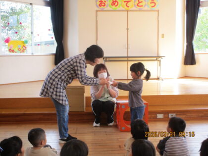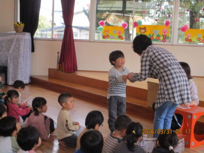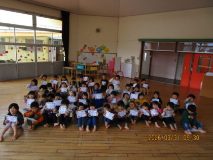 2026.4.1 日々のブログ3月31日 終了式 3・4歳クラスはホールで、小さいクラスは各保育室で終了式を行いました。 園長先生から修了証をいただき、お友だちと見せ合ったり、喜んだりしていました。 明日からは一つ大きいクラスに進級です。楽しみだね。